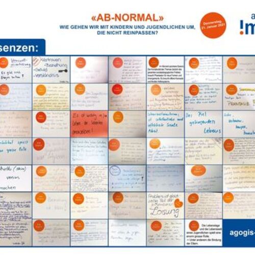 Rund 300 Personen haben am digitalen Impuls-Event «Ab-Normal» teilgenommen. Das grosse Interesse am Programm, den ExpertInnen und am Impuls-Film freut uns sehr und wir bedanken uns für die zahlreichen positiven und weiterführenden Feedbacks. Für einmal waren es die Teilnehmenden selber, die die Essenz des Impulses formuliert haben. Gerne veröffentlichen wir rechts mit dem Plakat die spannenden Gedanken zur Thematik und schliessen den Impuls damit ab.